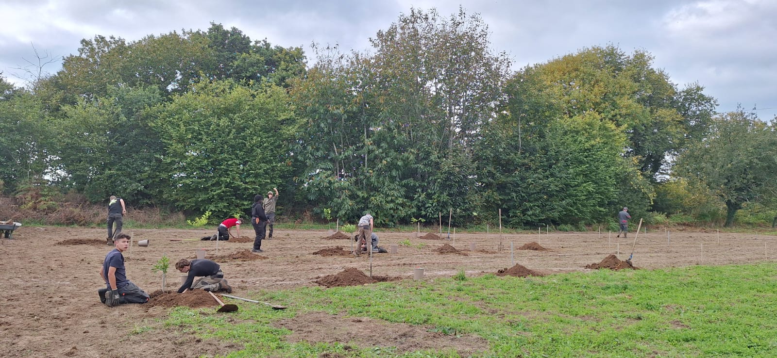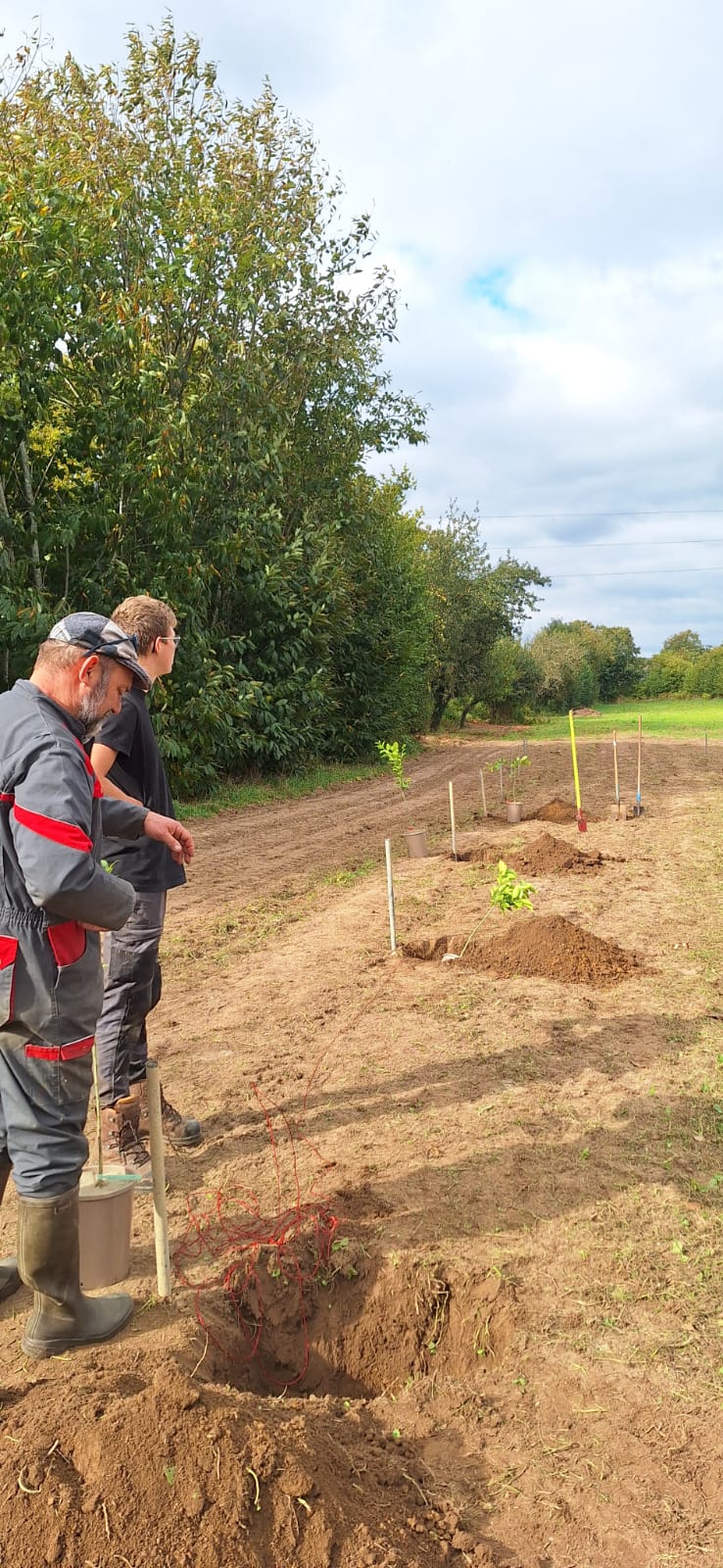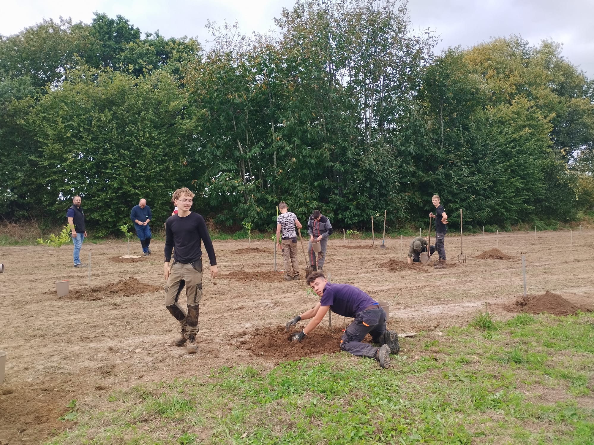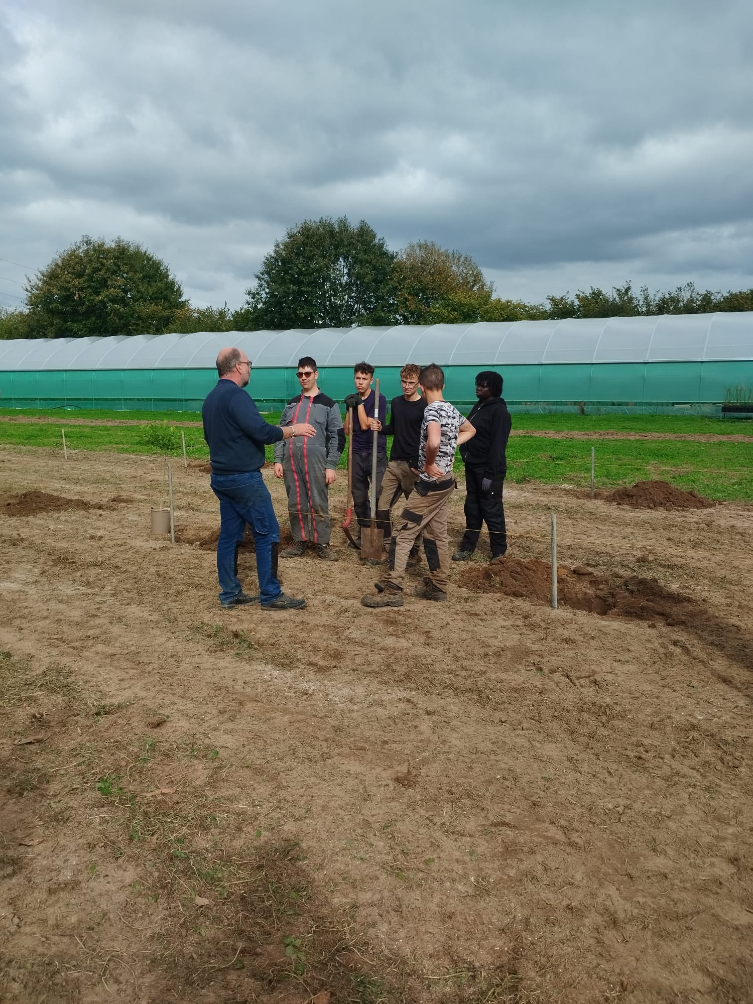Chantier de plantation d’agrumes pour les élèves de 1ʳᵉ Bac Pro Productions Horticoles chez Bruno Monchâtre à Ploumagoar. C'est l’occasion de perfectionner les gestes techniques et d’en apprendre plus sur la culture des agrumes